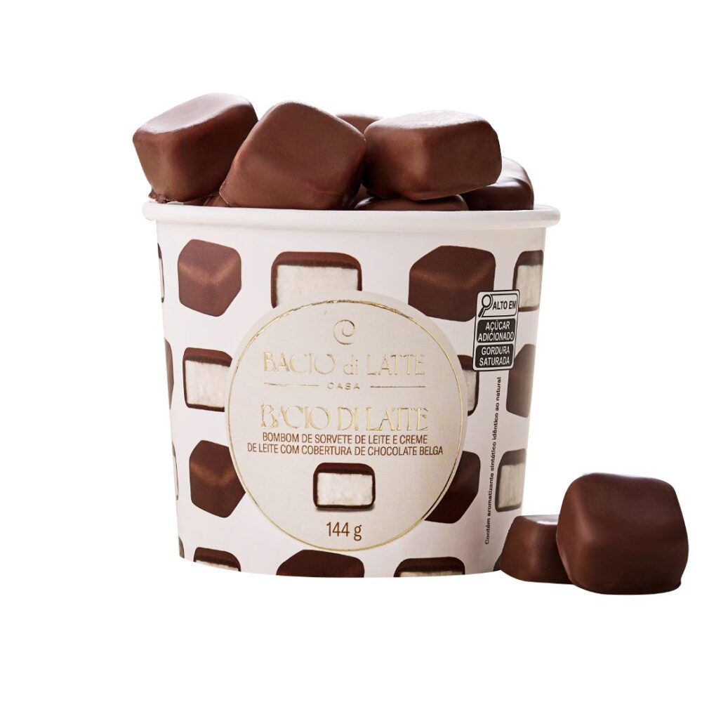Bombom de sorvete de leite e creme de leite com cobertura de chocolate belga, da Bacio di Latte.