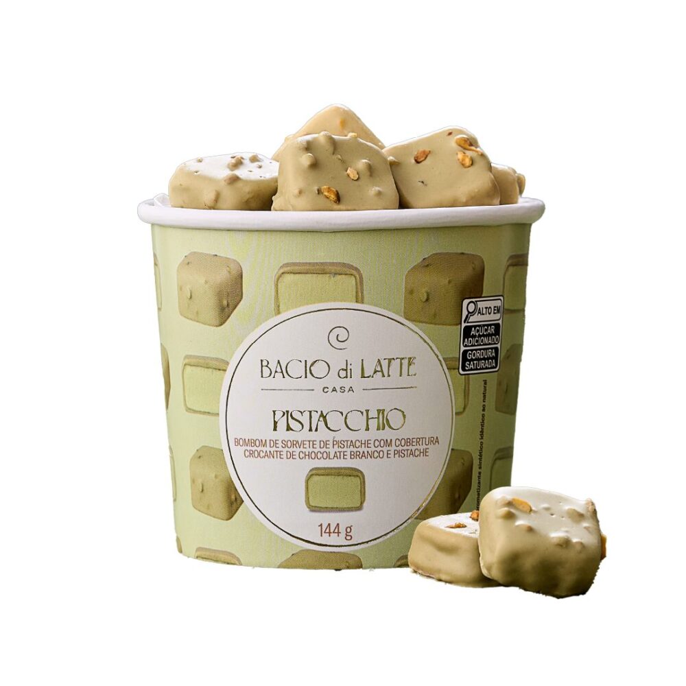 Bombom de sorvete de pistache com cobertura crocante de chocolate branco e pistache, da Bacio di Latte.